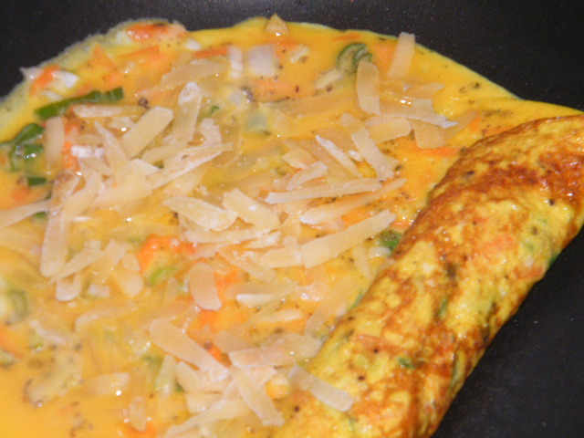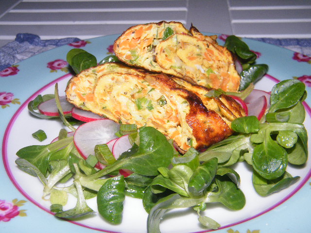 Jaja umutiti s mlijekom te dodati začine. Mrkvu naribati a mladi luk nasjeckati. Spojiti sastojke u jednu posudu i lijepo sjediniti. Tavu lagano nauljiti i staviti na najmanju moguću vatru te odmah izliti pola smjese. Ostaviti nekih 7-8 minuta da se lagano peče. Nakon tih 7-8 minuta pogledati dali je dobilo boju sa donje strane i ako je lagano pokušati srolati što uže ali samo do pola omleta, povući lagano prema sredini te dodati polovicu preostale smjese uz zaobljeni kraj omleta. Sad dolazi sir na red, lagano ga posuti po raširenom djelu i ostaviti nekih 5 minuta da se dalje lagano peče. Ponoviti postupak još jednom, srolati-povući-izliti preostalu smjesu. Nakon još 5 minuta srolati omlet do kraja i ostaviti ga 1 minutu da se zapeče. Izvaditi na podlogu za rezanje i pustiti 10 minuta da se prohladi te rezati na šnite.