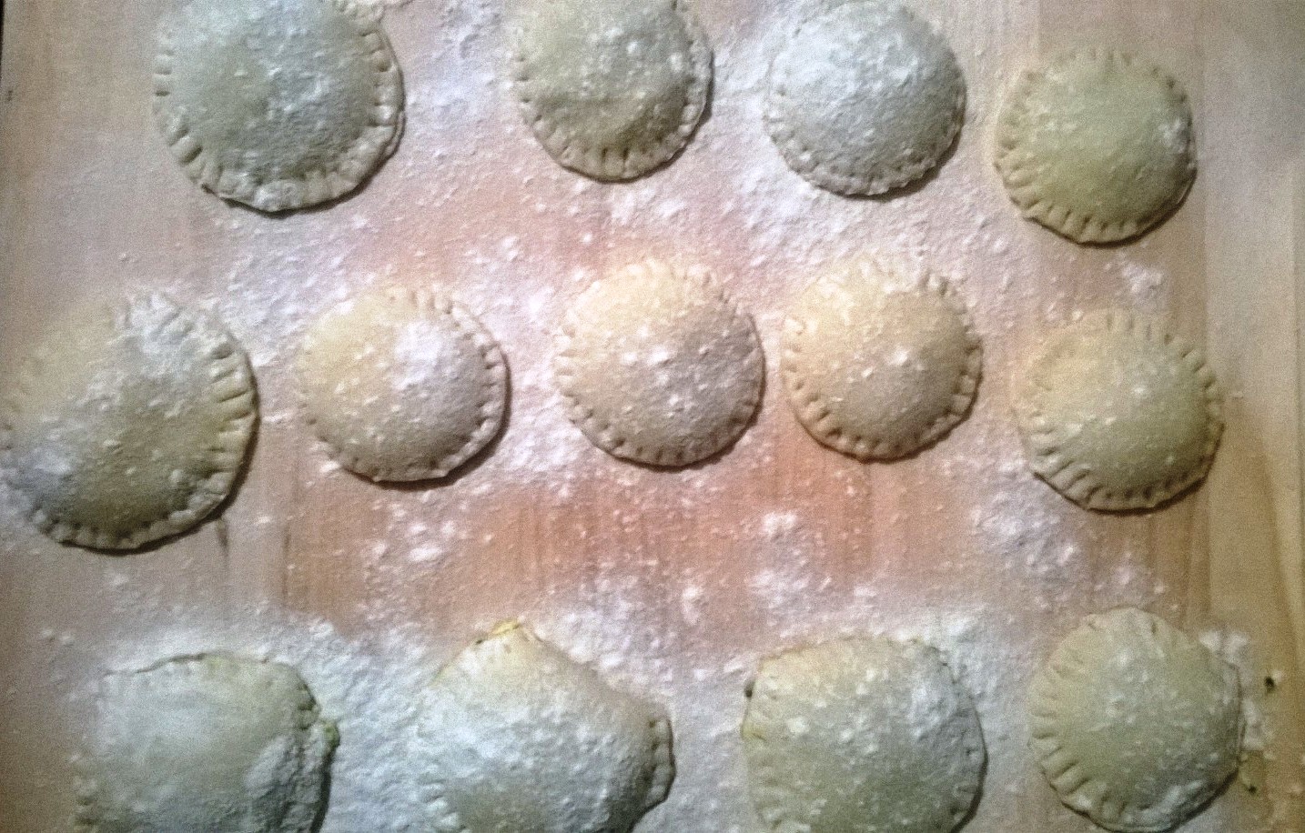 Tijesto razvaljati na cca 3-5 mm debljine i stavljati po jednu punu čajnu žličicu nadjeva ali samo na polovicu tijesta jer ćemo drugu polovicu iskoristi kao “poklopac”. Dakle, preklopimo drugom polovicom tijesta i režemo čašom okrugle oblike koje zatim malo pritisnemo na rubovima s vilicom. Taj postupak u isto vrijeme spaja ugodno s korisnim jer sprječavam nadjev da iscuri a ujedno ukrašavamo same raviole.