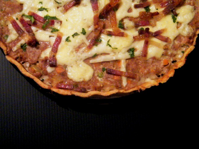 Pećnicu zagrijati na 180 stupnjeva a tijesto razvući na 1/2 cm debljine i prebaciti ga u lagano namašćeni kalup. Na nekoliko mjesta ga probušiti vilicom i staviti 10 minuta u pećnicu. Izvaditi kalup van pećnice i podići temperaturu na 200 stupnjeva. Nadjev lijepo rasporediti na tijesto i staviti na 30 minuta u pećnicu. Kada se dobije lijepa boja zapečenog mesa posuti ribani sir i dodati sjeckanu šunku te vratiti na još 10 minuta u pećnicu. Za kraj, ukrasiti svježim peršinom ili bosiljkom.