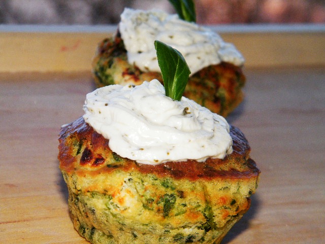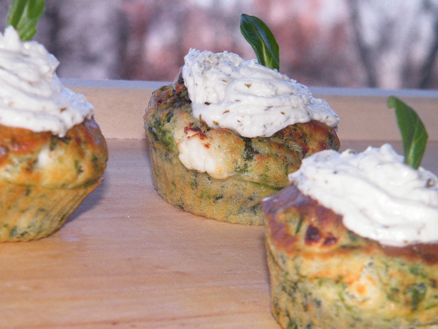 Muffine pustiti da se malo prohlade (5-10 minuta) a sirni namaz staviti u vrećicu za ukršavanje i ukrasiti po želji. Za kraj staviti listić matovilca/peršina i poslužiti.
