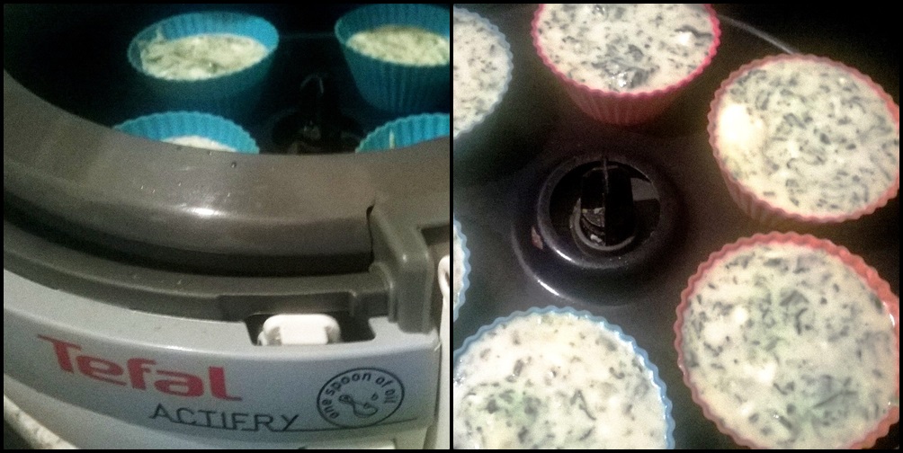 U jednu posudu staviti sve sastojke osim špinata, fete i sirnog namaza te dobro izmiješati (mikser, vilica, pjenjača…kako tko voli). Špinat, ukoliko je svježi, usitniti po želji a fetu prstima iskidati na manje komade. Žlicom/vilicom polagano umiješati špinat i fetu sa smjesom te dobiveno rasporediti u kalupe za muffine. Ja sam koristio Tefal Actifry fritezu za pečenje (17 minuta) ali ukoliko idu u pećnicu, 180 stupnjeva nekih 20-25 minuta.