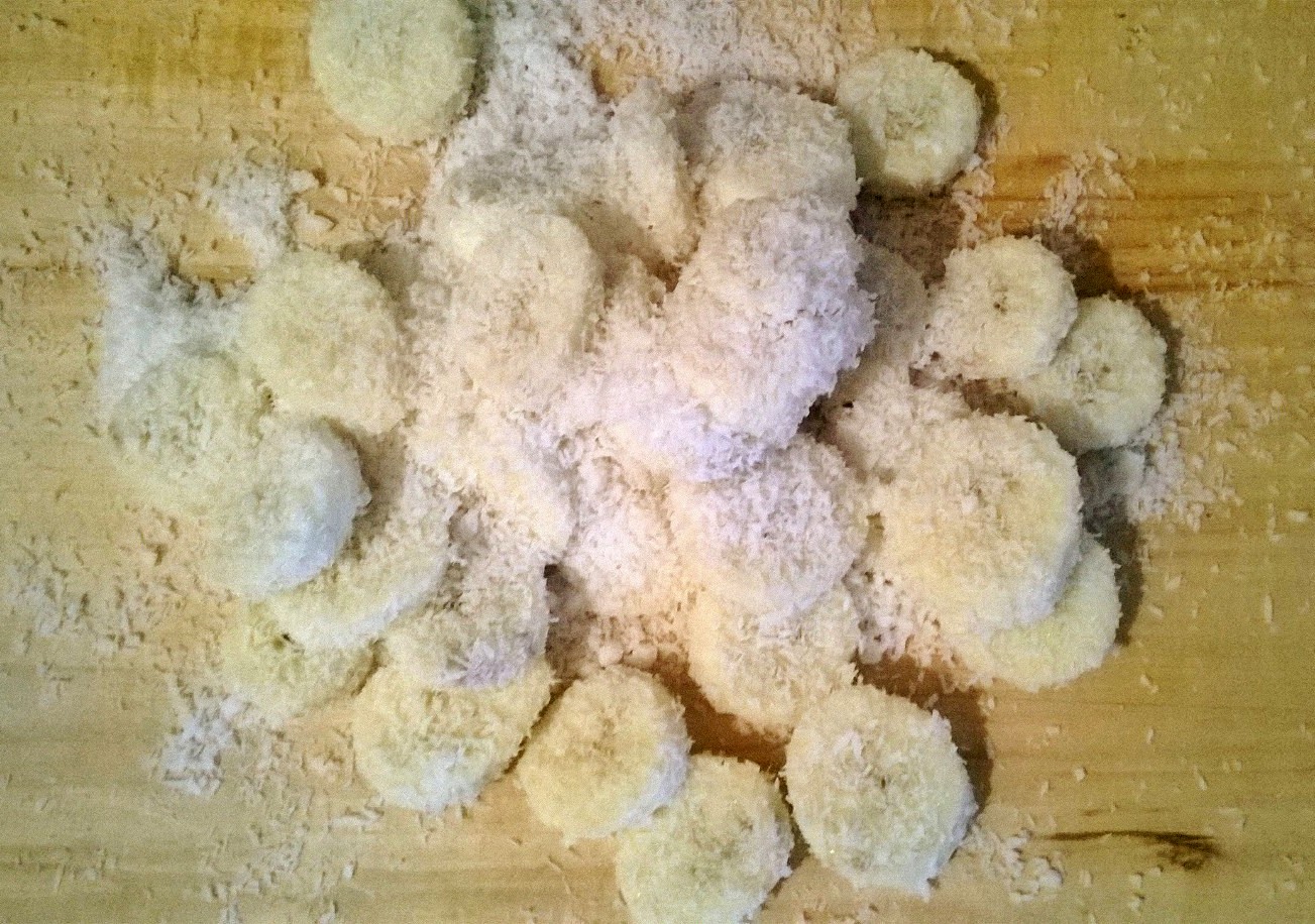 Banane oguliti i narezati na kolutiće te ih uvaljati u kokosovo brašno.