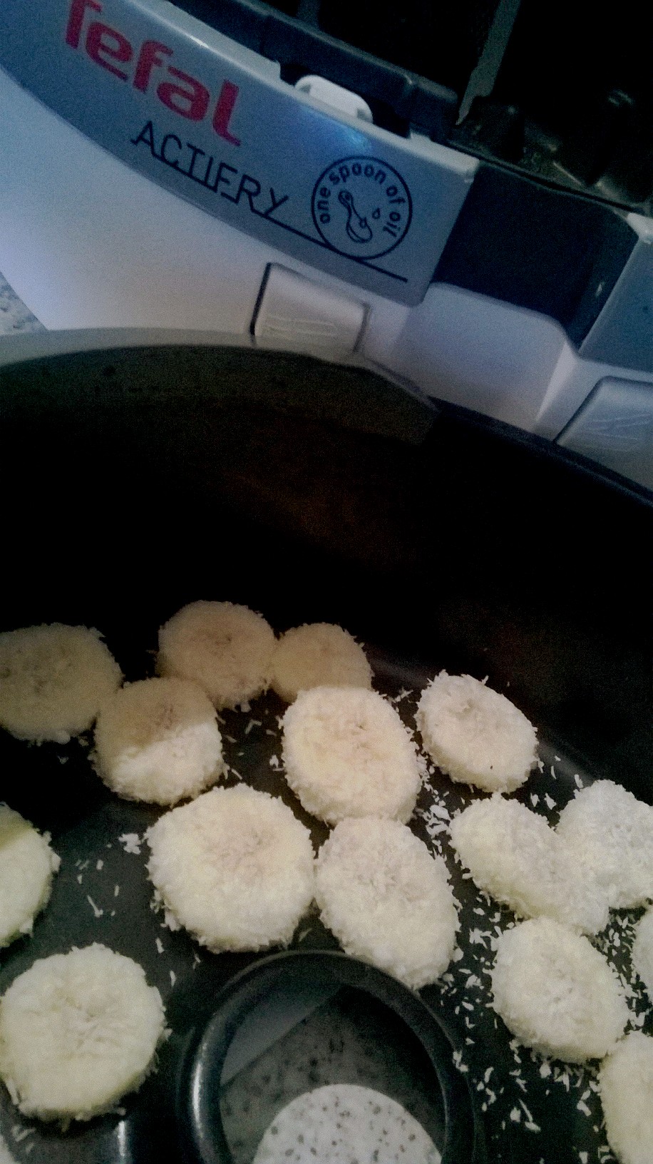 Kolutiće rasporediti po fritezi tako da se ne preklapaju, posuti uljem i uključiti fritezu na 5 minuta s tim da nakon 2-3 minuta je potrebno preokrenuti ih.