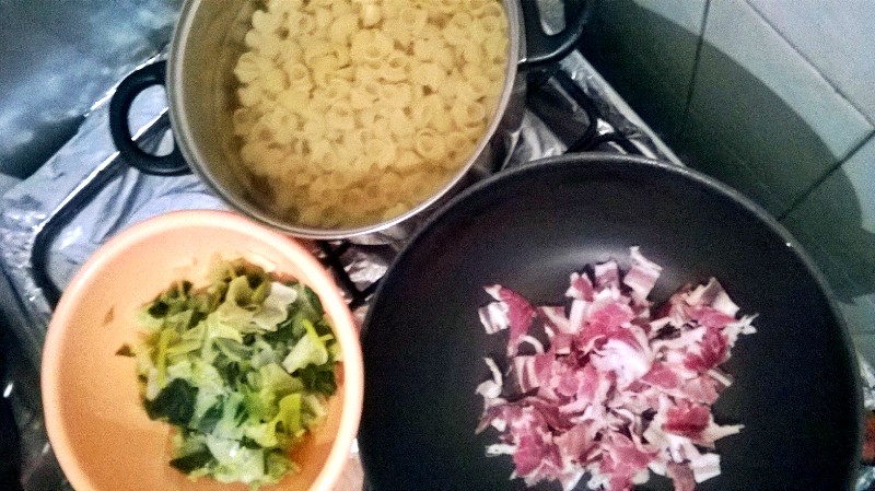 U većem loncu skuhamo tjesteninu. “Trik” kod kuhanja tjestenine je da treba puno vode, gotovo 10 puta više vode nego količine tijesta (na ovih pola kg bi bilo idealno barem 5 litara vode) te da ne stavljate nikakvu masnoću nego je potrebno promiješati s vremena na vrijeme. Također, sa soli praktički ne možete pretjerati jer će tjestenina upiti soli taman koliko joj treba. Vrijeme kuhanja naravno prilagodite vrsti tjestenine te kad je gotova “šokirajte” ju hladnom vodom da se proces kuhanja zaustavi.