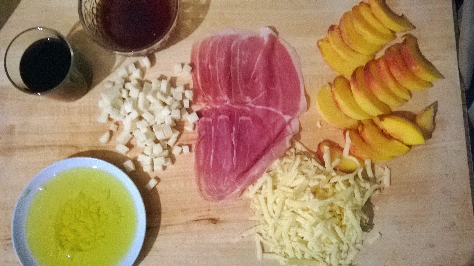 Razvući tijesto na pobrašnjenoj podlozi te prebaciti u tepsiju. Nasjeckani češnjak pomiješati s maslinovim uljem te premazati tijesto pazeći da se češnjak ravnomjerno rasporedi. Staviti 3-4 minute u zagrijanu pećnicu (220 stupnjeva). Izvaditi van te posložiti pršut i sir te povrh svega na tanko narezane kriške breskve.