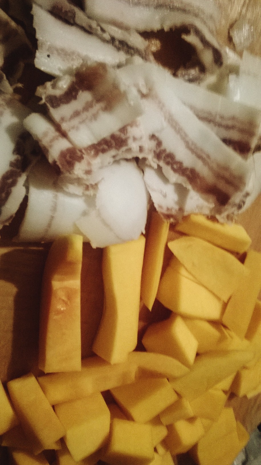 Tikvu narezati na manje trakice te ih začiniti navedenim začinima. Slaninu narezati također na trake i to tolike da se može omotati tikva.