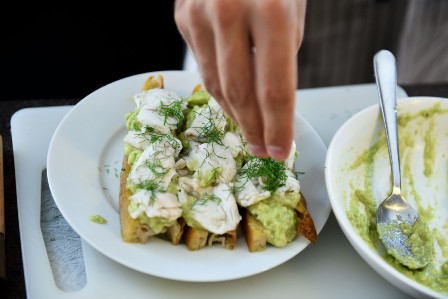 Od jednog fileta file smo radili predjelo (bruschette) i to na način da smo potezima noža u suprotnom smjeru od smjera “rasta” ribljeg mesa, rezali tanke šnitice te ih odmah stavljali u limunov sok. Od avokada napravimo bazu i to kao neki jednostavni i brzi guacamole tako da avokado vadimo žlicom u tankim šnitama te ga stavljamo u zasebno posudu u koju smo dodali također sok jednog limuna, sol i papar (ne bi škodilo ni malo češnjaka i luka). Sve dobro zgnječimo vilicom te stavimo u hladnjak na minimalno pola sata. Kruh prepečemo na grill tavi s malo maslinovog ulja, češnjaka i začinskog bilja te slažemo bruschette: kruh, avokado, brancin. Dodati malo lista komorača i par kapi maslinovog ulja.