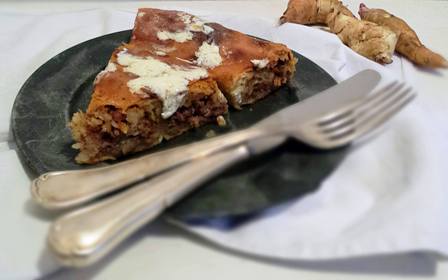 Tijesto razvijte na platnenoj podlozi koju ste pobrašnili. Pomognite se valjkom za valjanje tijesta (oklagijom :D) te dovršite tako da ispod tijesta podvučete ruke i polagano ih povlačite prema van s time da vrhovima prstiju dodirujete tijesto. Višak tijesta odrežite a površinu poškrpite rastopljenim maslacem. Meso i čičoku sjedinite te podijelite po tijestu koje zatim zarolajte u roladu. Malo još rukama “razvucite” ako Vam je rolada predebela te prebacitu u posudu za pečenje koju ste također malo premazali maslacem.