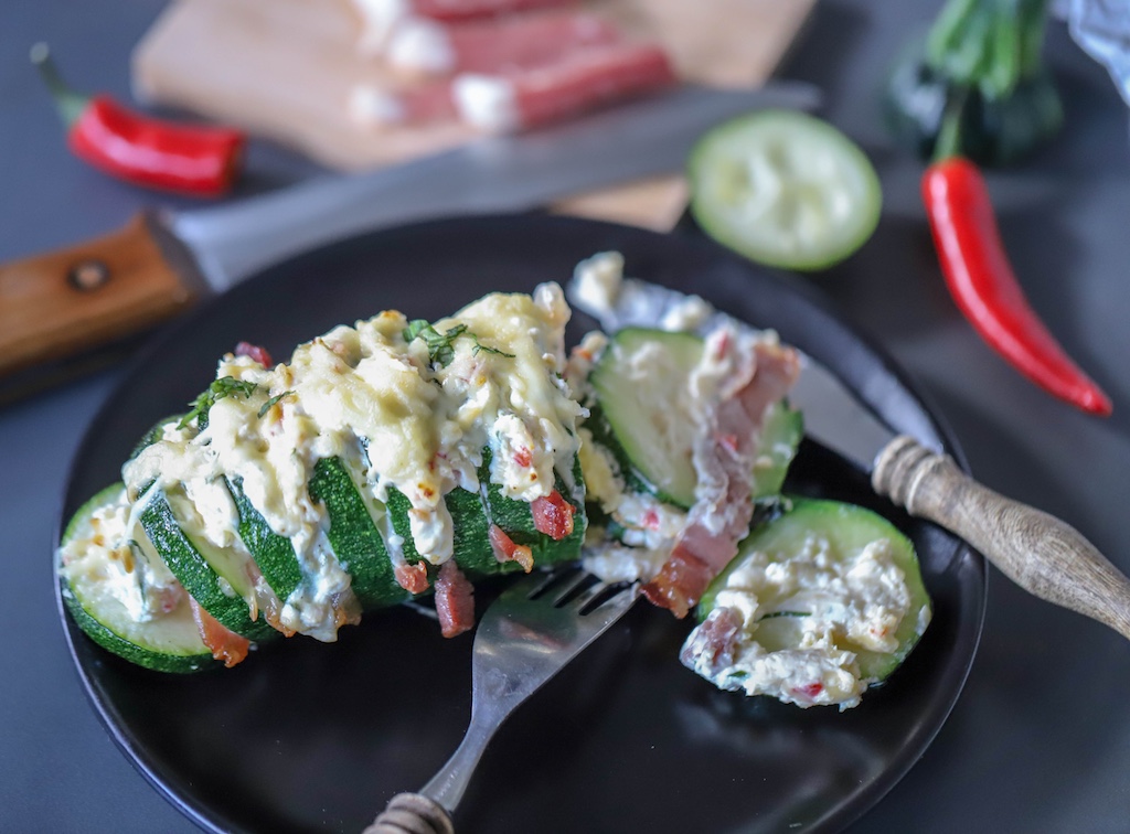 Zadnji korak je već napola pečene tikvice napuniti smjesom od krem sira, posuti s još malo naribanog sira i zapeći 10ak minuta u pećnici dok se sir rastopi.