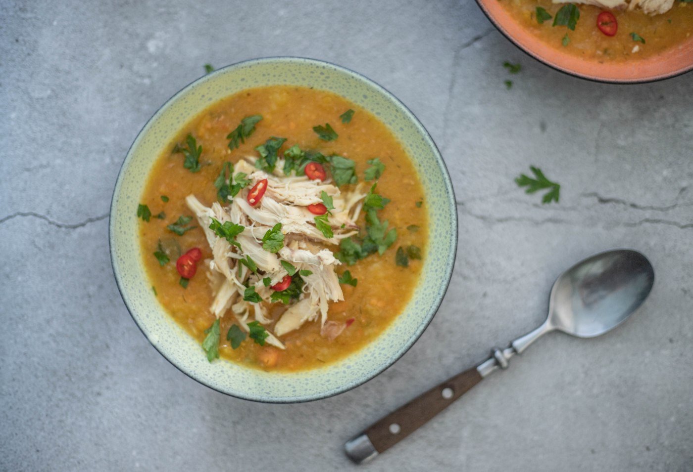 Poslužiti juhu uz dodatak piletine, sjeckanog peršina i sitno sjeckanom čili papričicom.