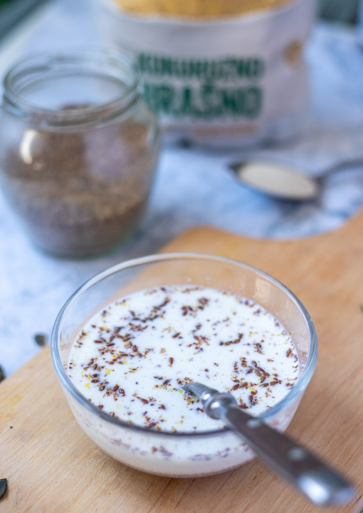 Sjemenke lana samljeti u električnoj sjeckalici ili mlincu te ih natopiti u 1/3 mlijeka. Ovim
