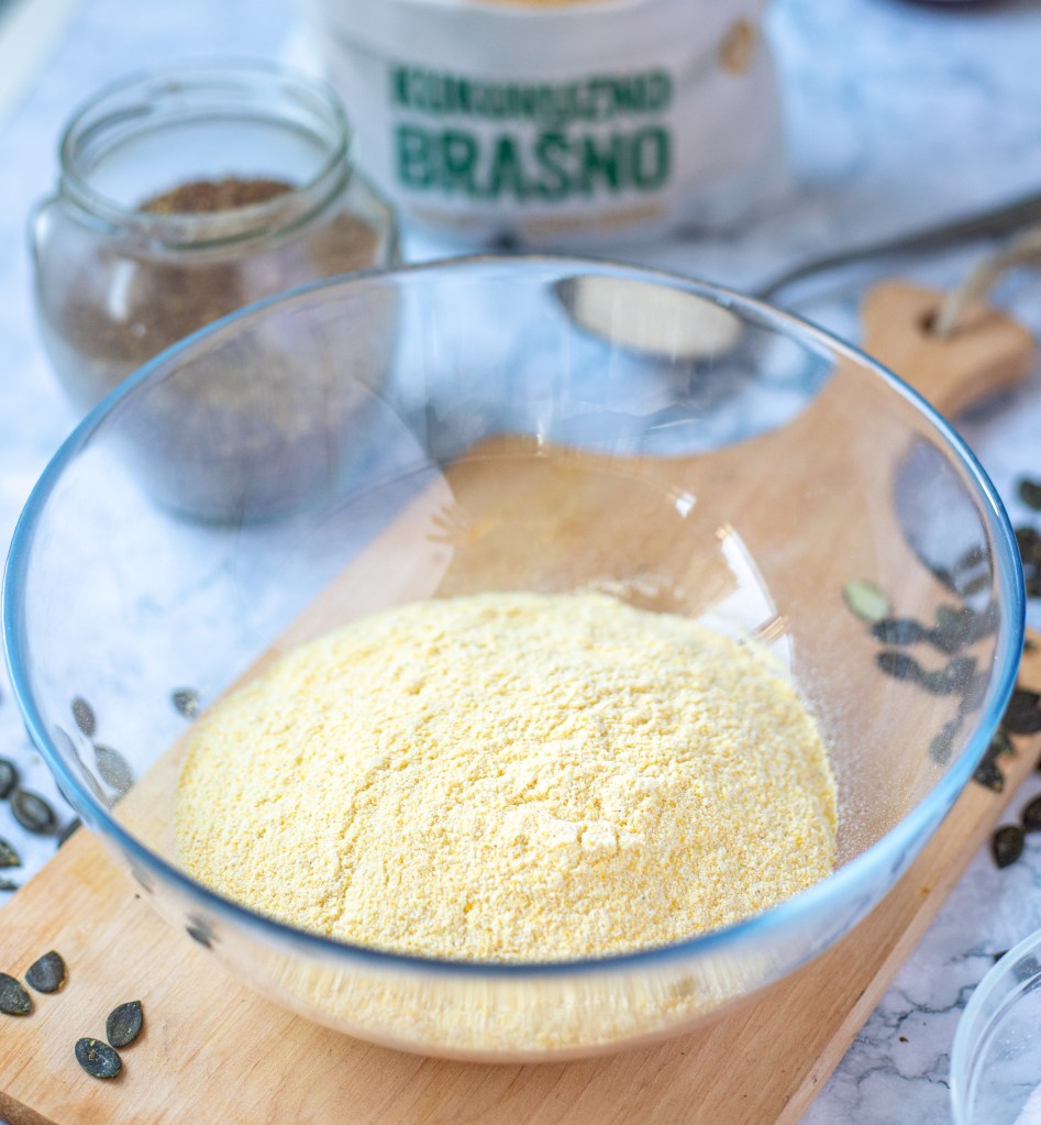U veću posudu dodati kukuruzno brašno, kvasac i sol. Lagano pomiješati te dodati dalje lanene