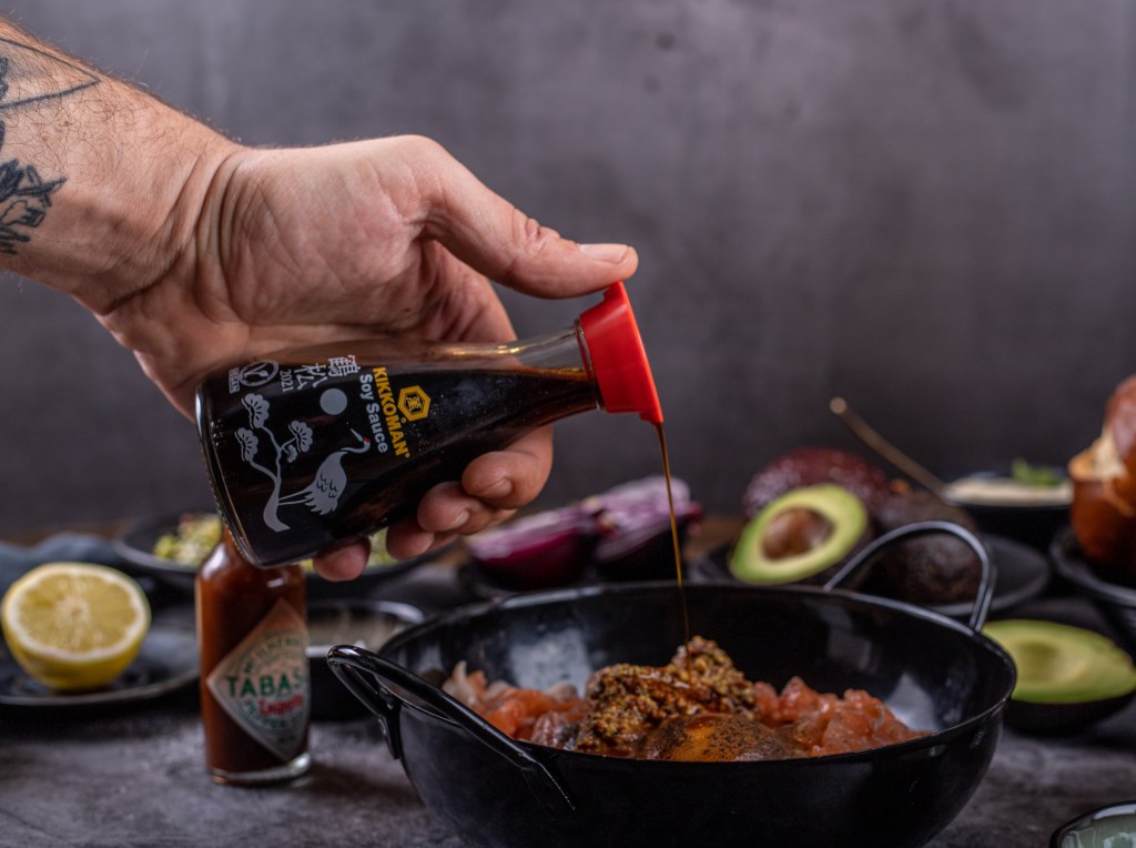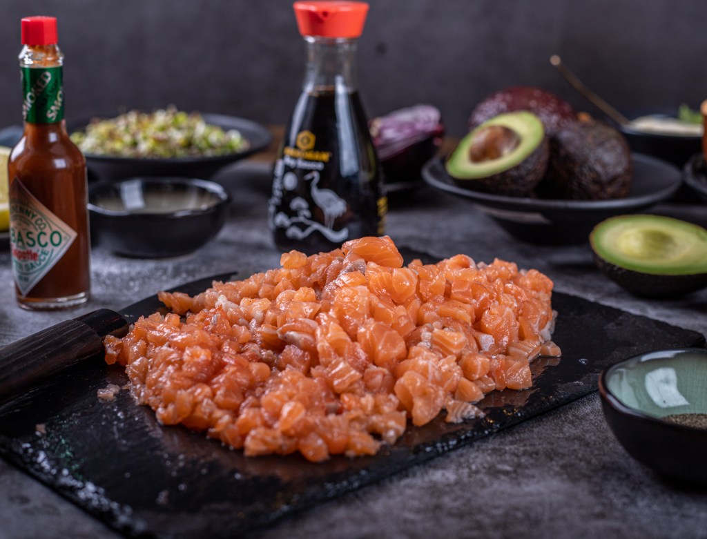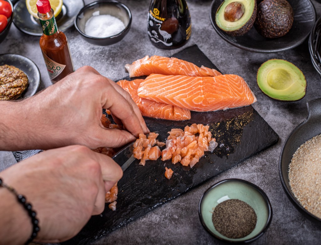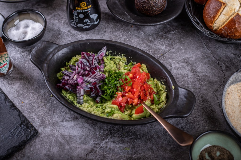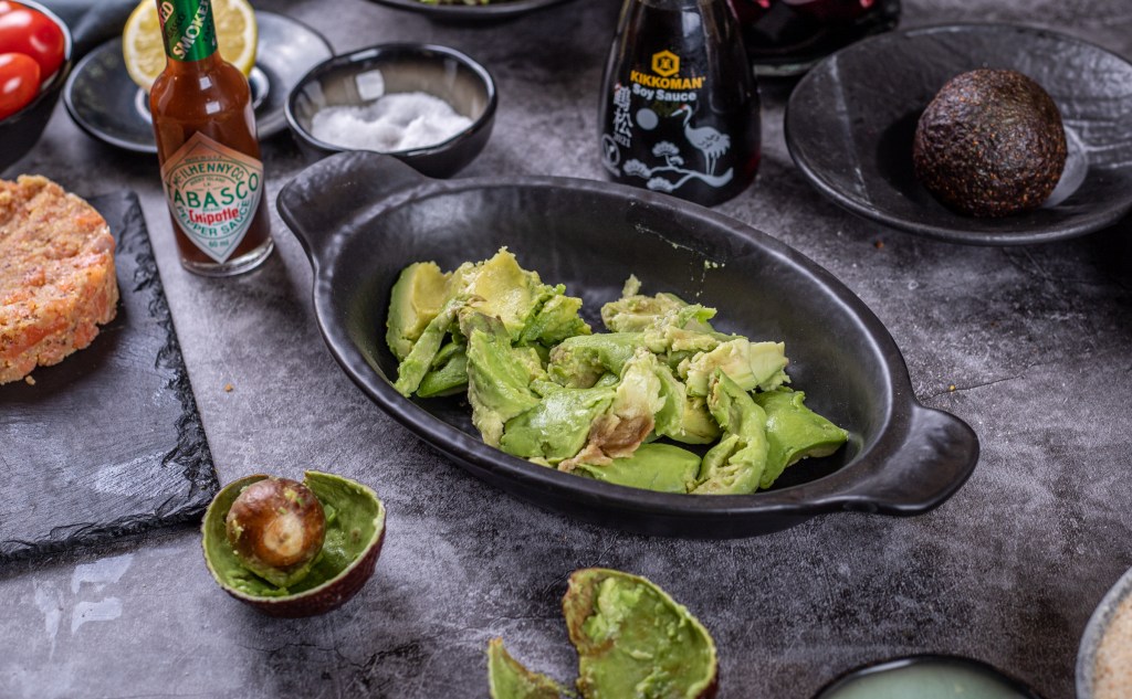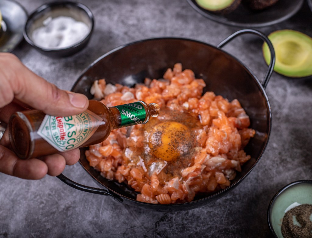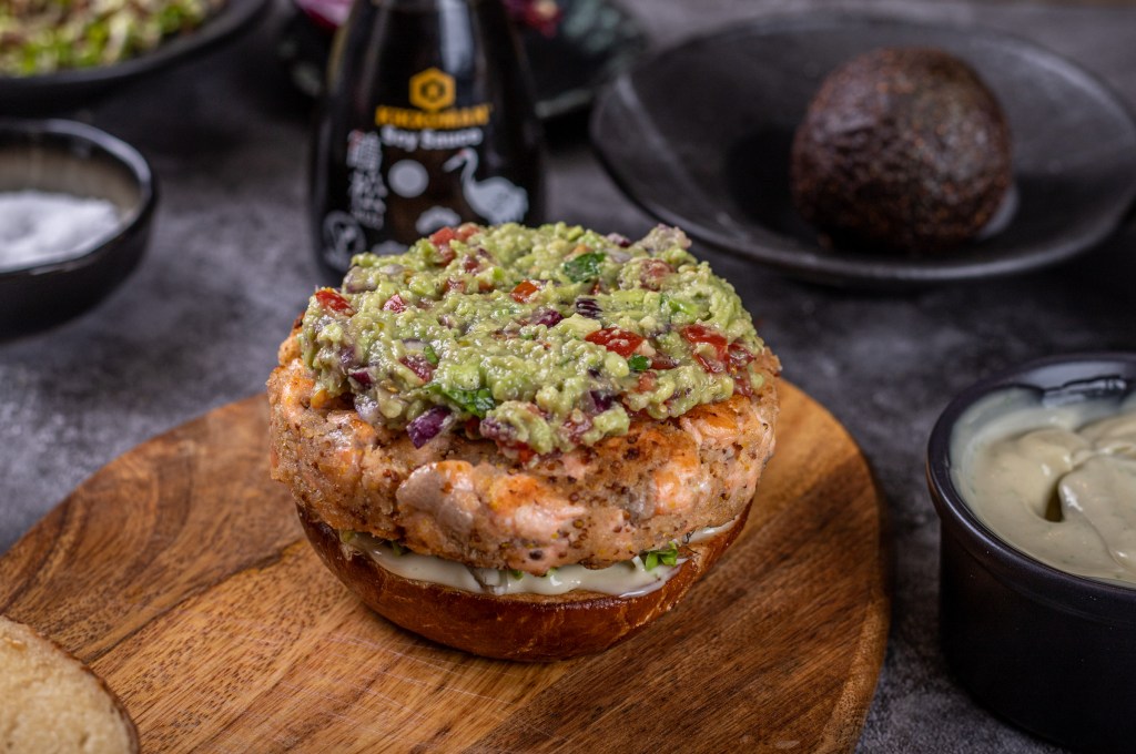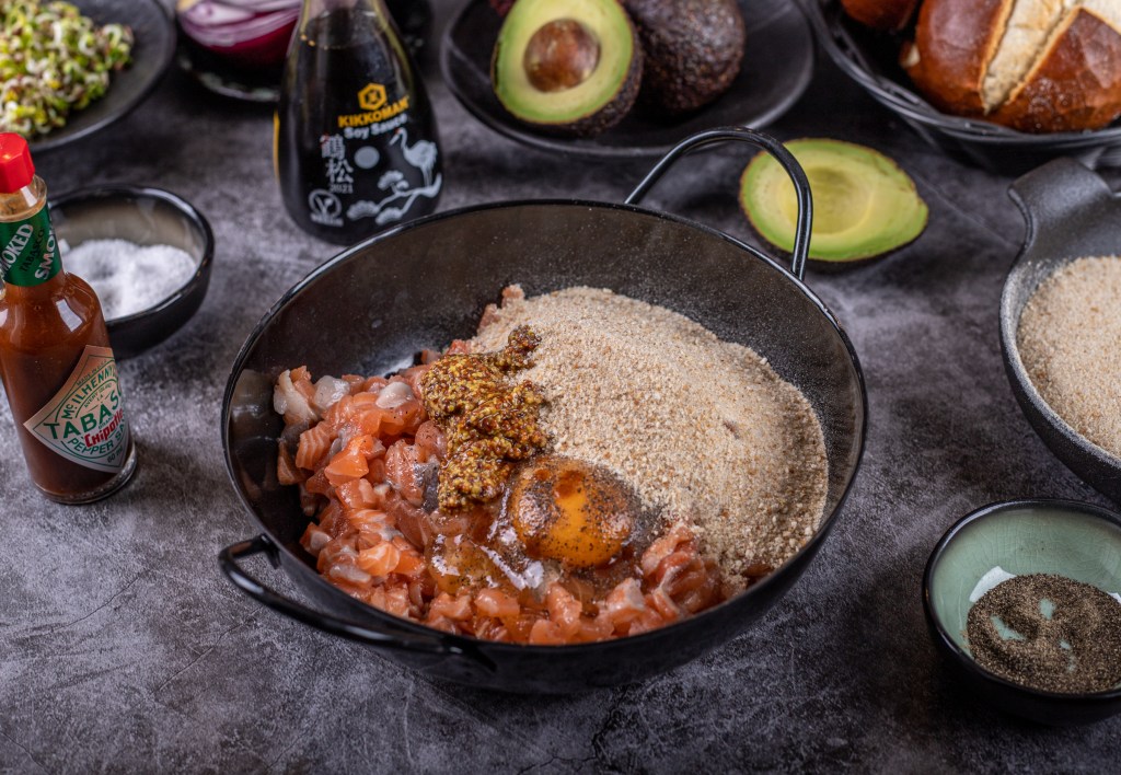Lososu skinuti kožu te ga narezati na sitne kockice. Staviti losos u posudu te mu dodati jaje, sol i papar, tabasco umak, senf, soja umak i krušne mrvice. Dobro sve promiješati te oblikovati 4 “pattya”. Staviti ih sa strane te pripremiti guacamole.