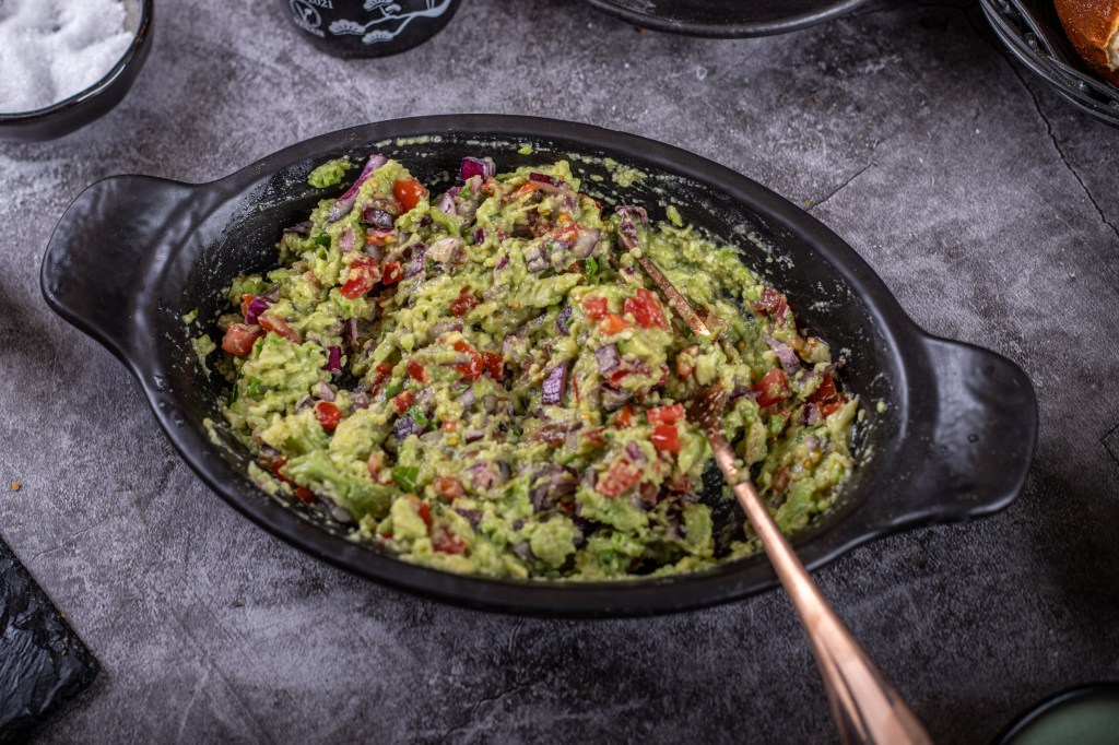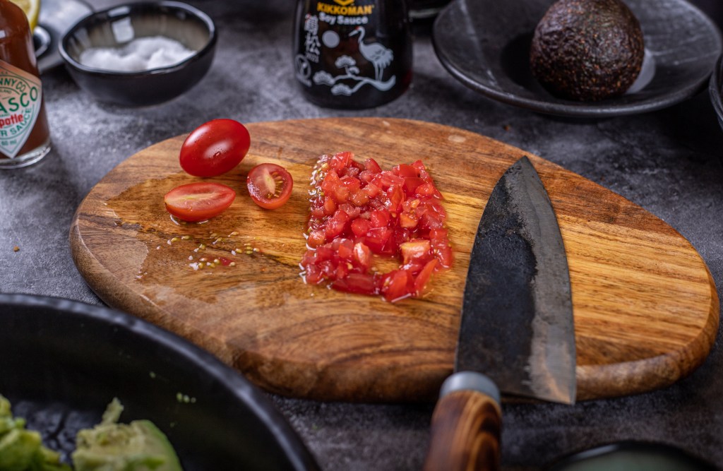 Avokado prepoloviti, maknuti košticu te pomoću žlice izvaditi “meso”. Staviti avokado u posudu te dodati sitno sjeckanu cherry rajčicu, sitno rezani ljubičasti luk, sok jednog limuna, sitno sjeckani peršin i malo čilija. Dobro promiješati da sve bude ujednačeno i staviti u hladnjak dok se ne pripremi ostatak.