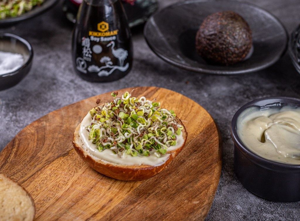 Peciva prepoloviti te ih kratko zapeći na tavi. Premazati donje pecivo s wasabi majonezom, posuti s klicama rotkvice staviti na njega pečeni losos. Na losos staviti guacamole te završiti sa svježom salatom i poslužiti.
