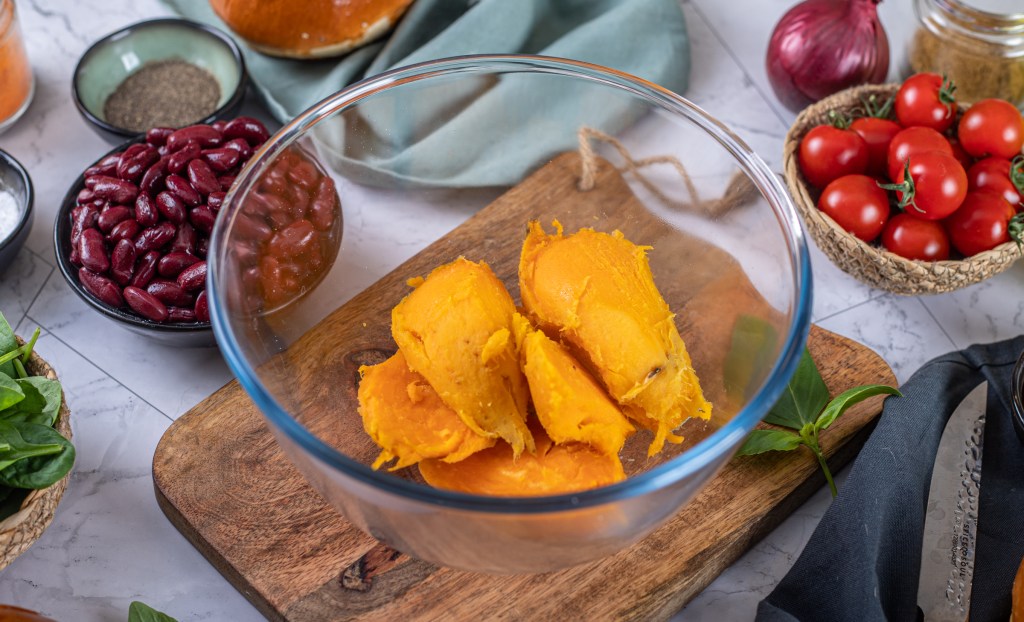 Priprema ovog burgera je poprilično jednostavna iako zahtjeva nešto više vremena. Započnite tako da batate na nekoliko mjesta probodete vilicom, stavite ih u posudu za pečenje, prekrijete folijom te pečete na 200 stupnjeva, 45-60 minuta tj.dok se unutrašnjost batata ne ispeče. Pečeni batat ogulite te “meso” stavite u zdjelu srednje veličine. Pomoću gnječilice za krumpir napravite pire od batata. Rižu skuhajte prema uputama s pakiranja te ohladite i dodajte batatu skupa s ocijeđenim i ispranim grahom. Orahe nasjeckajte na sitno I ubacite ih u zdjelu. Dodajte začine i sve dobro promiješajte. Ako sam je smjesa premokra dodajte po potrebi zobene pahuljice. Oblikujte 4 “patty-a” te ih stavite na papir za pečenje u posudi za pečenje. Prelijte ih s maslinovim uljem te pecite u zagrijanoj pećnici na 200 stupnjeva – 30 minuta. Nakon isteka 30 minuta oprezno preokrenite patty-e te ih pecite još 15 minuta.