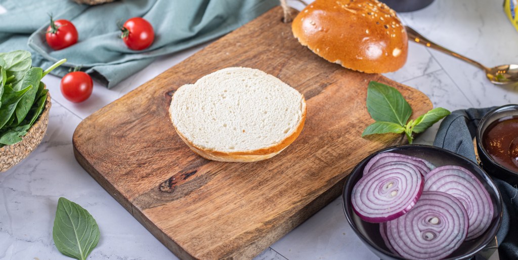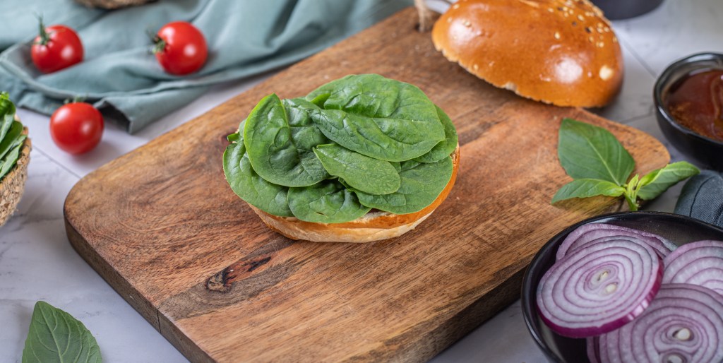 Pecivo prerežite na pola te ga lagano tostirajte. Umak stavete na donju stranu pecivu te nastavite odmah sa slaganjem baby špinata. Na špinat stavite pečeni patty te sitno sjeckani ljubičasti luk i tanko reyanu cherry rajčicu. Završite burger s drugom polovicom peciva na koju ste također namazali malo umaka.