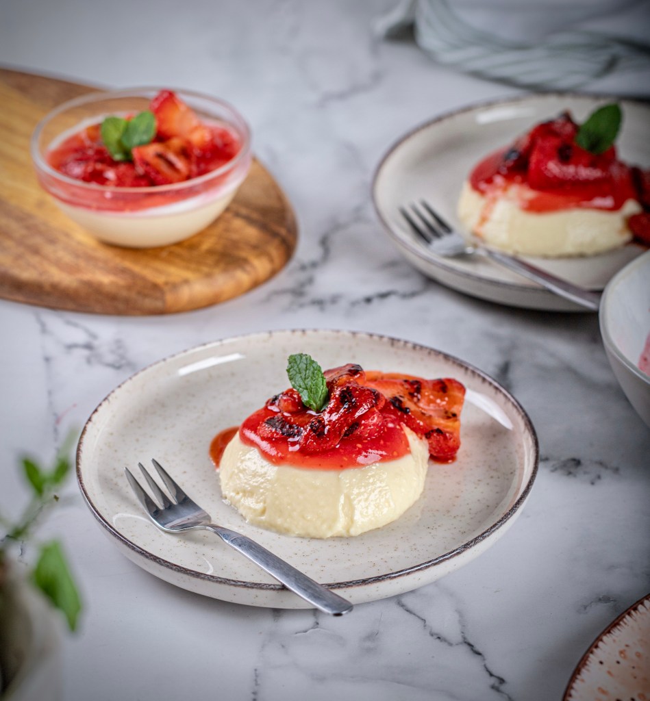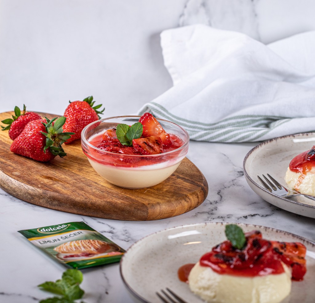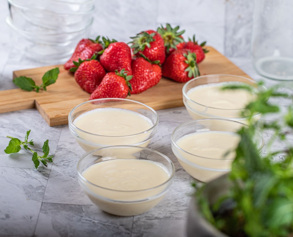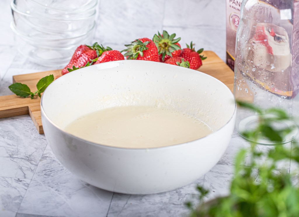 U zdjelu srednje veličine ulijte mlijeko i vrhnje za kuhanje. Dodajte sadržaj vrećice za panna cottu te miksajte električnim mikserom na srednjoj brzini 1 minutu. Ukoliko želite desert preokrenuti iz zdjelice kada se ohladi onda obavezno zdjelice isperite hladnom vodom prije ulijevanja panna cotta kreme. Ukoliko ju poslužujete u zdjelici onda slobodno preskočite ispiranje. Sipajte kremu te zdjelice stavite u hladnjak dok napravite preljev i ispečete jagode.