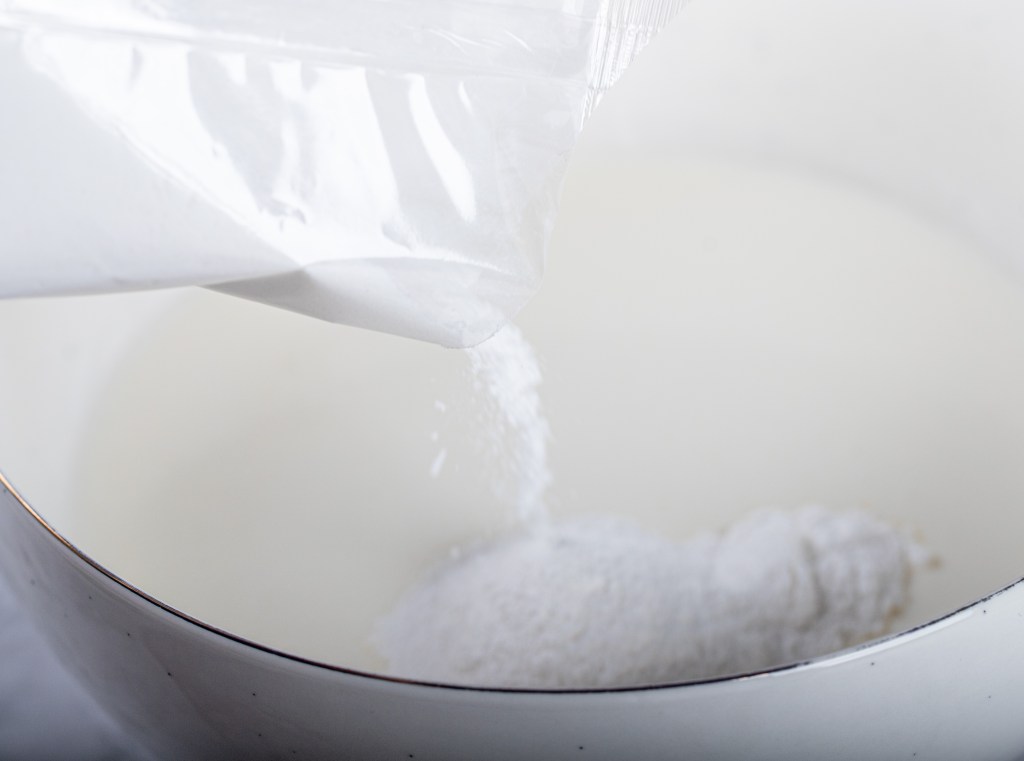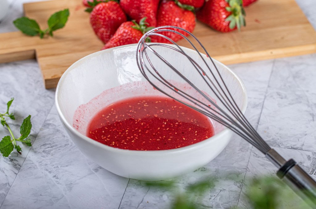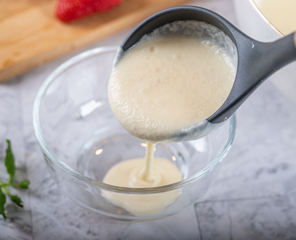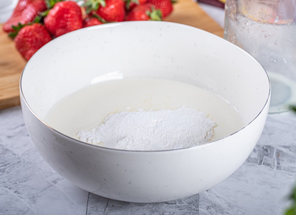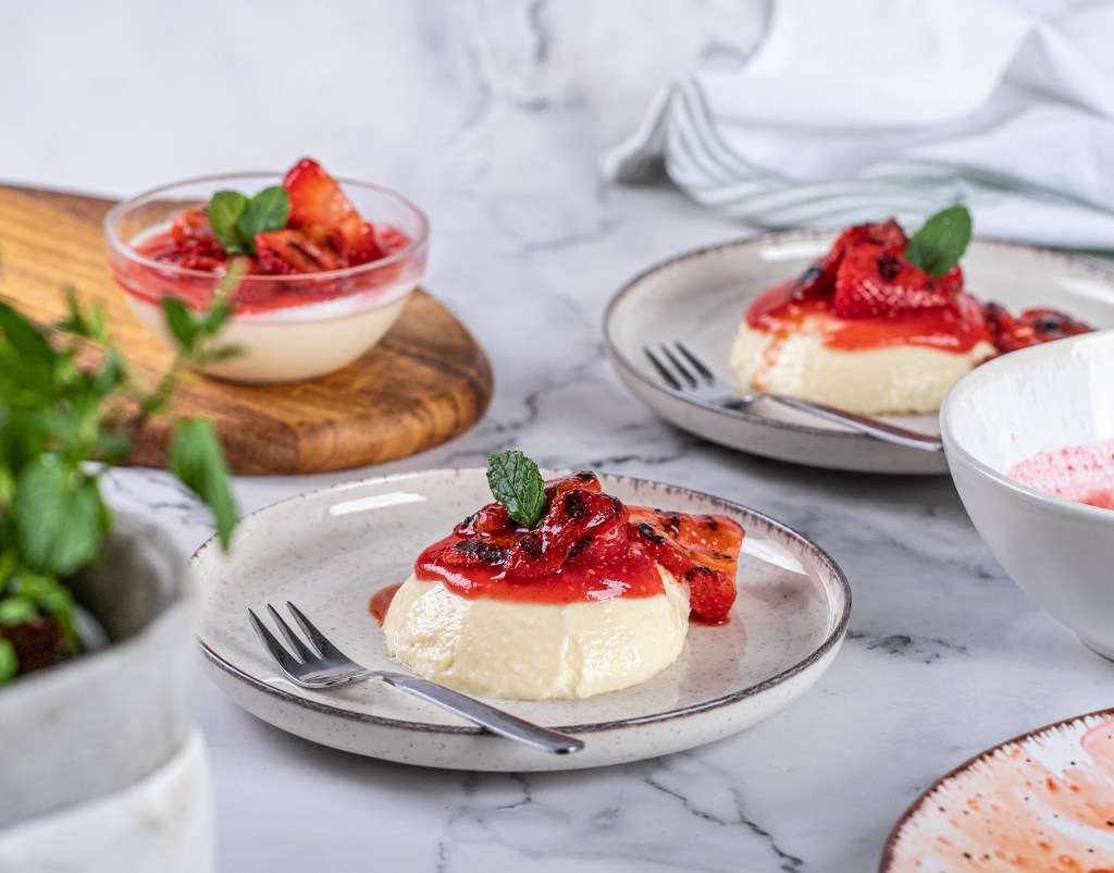 U zdjelu srednje veličine ulijte mlijeko i vrhnje za kuhanje. Dodajte sadržaj vrećice za panna cottu te miksajte električnim mikserom na srednjoj brzini 1 minutu. Ukoliko želite desert preokrenuti iz zdjelice kada se ohladi onda obavezno zdjelice isperite hladnom vodom prije ulijevanja panna cotta kreme. Ukoliko ju poslužujete u zdjelici onda slobodno preskočite ispiranje. Sipajte kremu te zdjelice stavite u hladnjak dok napravite preljev i ispečete jagode.