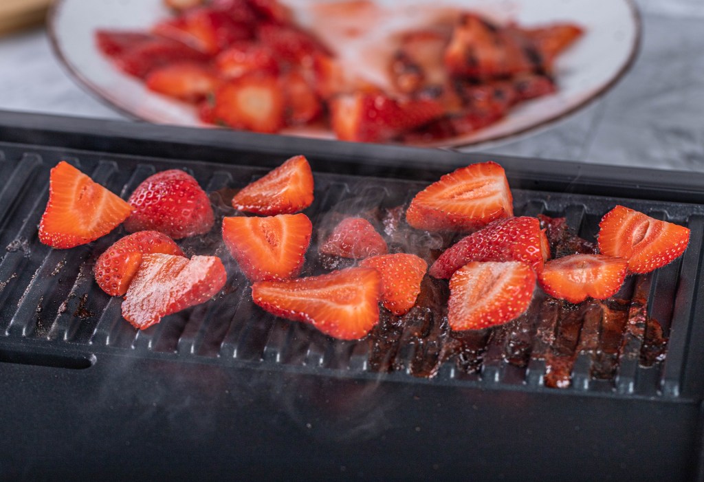 Jagode prepoloviti i pomiješati sa limun šećerom te ih peći na grillu 2 minute sa svake strane.