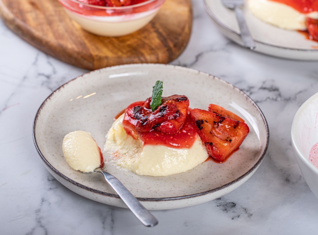 Panna cottu izvaditi iz hladnjaka i preokrenuti ju na tanjur za posluživanje. Podijeliti ravnomjerno umak od maline te po vrhu staviti grillane i karamelizirane jagode te listić mente. Poslužiti dok je panna cotta još hladna.