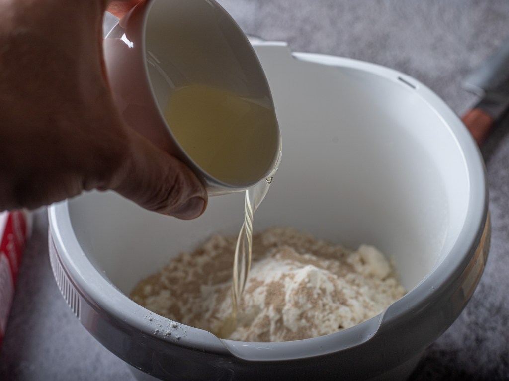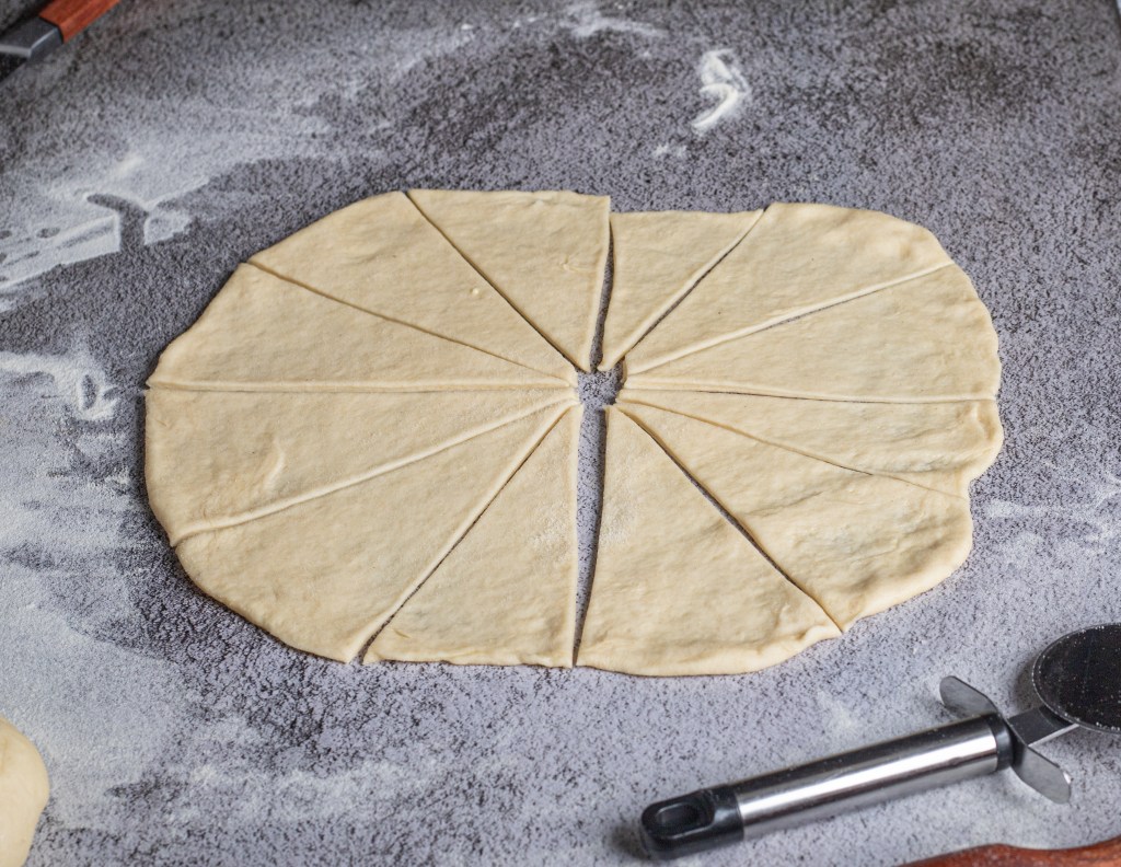 U veću zdjelu dodati toplu vodu, ulje i mješavinu za kiflice te miksati električnim mikserom na srednjoj brzini nekih 3-4 minute. Tijesto podijeliti na 2 dijela te jedan odmah razvaljati u krug na blago pobrašnjenoj podlozi. Narezati krug na 12 jednakih trokuta te na svaki staviti malo pripremljene smjese za punjenje. Zarolati kiflice I staviti ih na podlogu za pečenje preko koje smo stavili papir za pečenje. Ponoviti postupak s drugom polovicom tijesta.