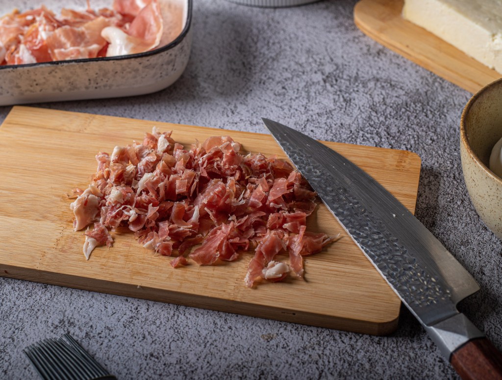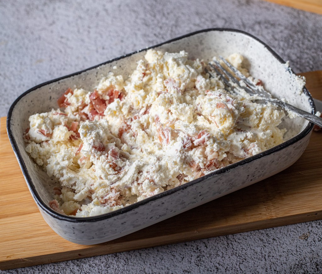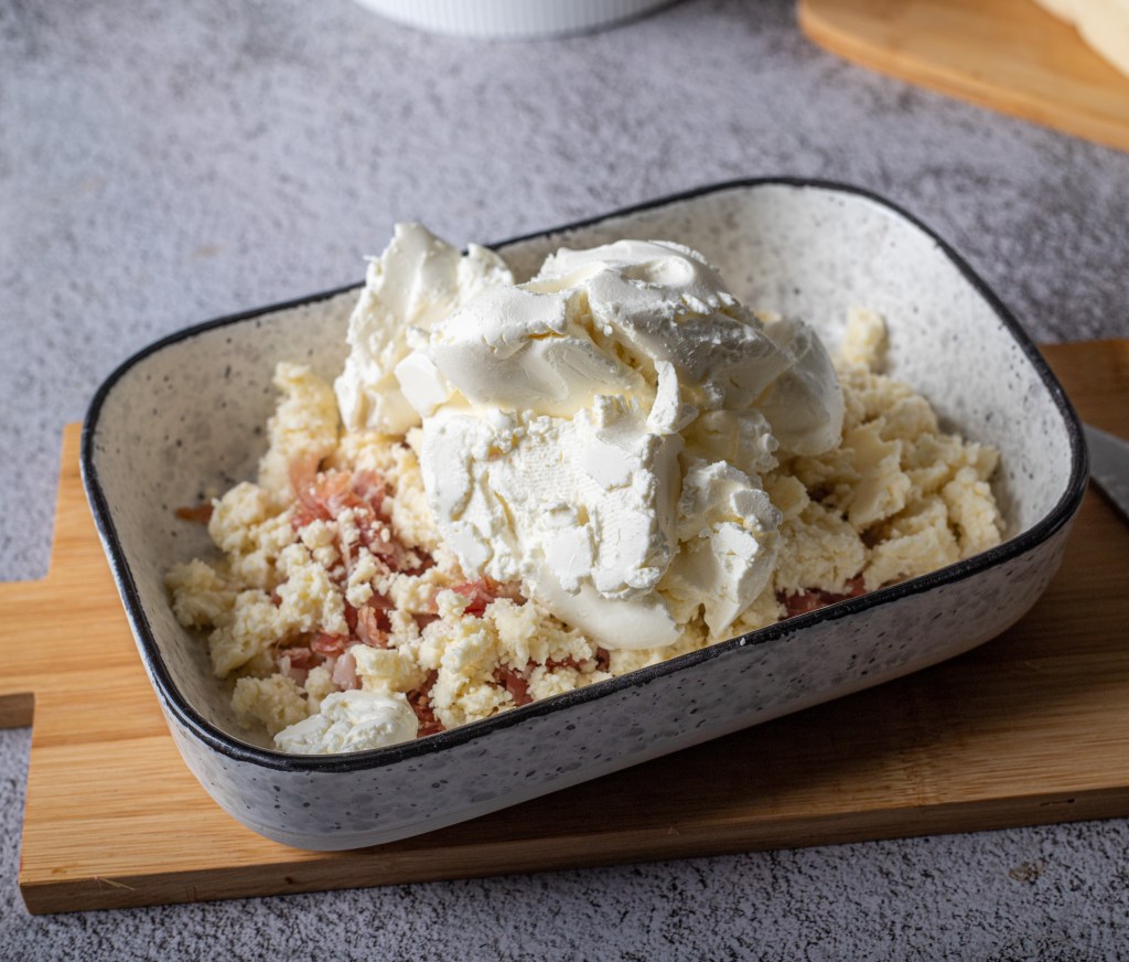 Krem sir suavity u zdjelu srednje veličine te mu dodati sitno rezani pršut i izmrvljeni kravlji sir. Posloliti malo i dobro sjediniti sve.
