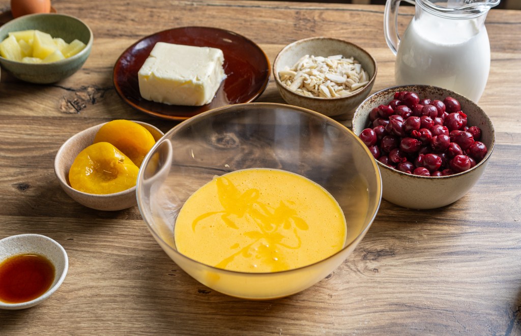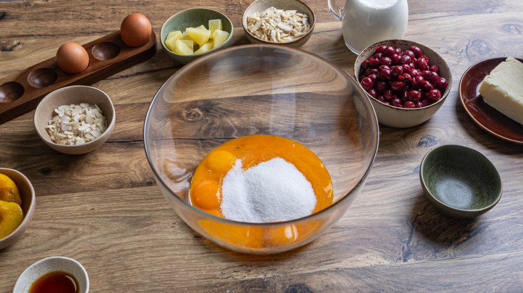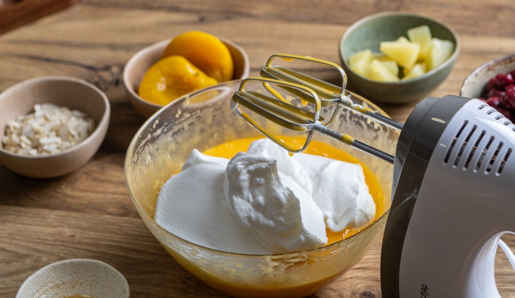 Voće je potrebno dobro ocijediti te ananas i breskve sitno narezati. Višnje možete također narezati (moja preporuka) ili ih ostaviti cijele. I sjeckane bademe i one u listićima kratko popržite ili ispecite u pećnici. Ovih 160ml šlaga čvrsto izmiksajte.
