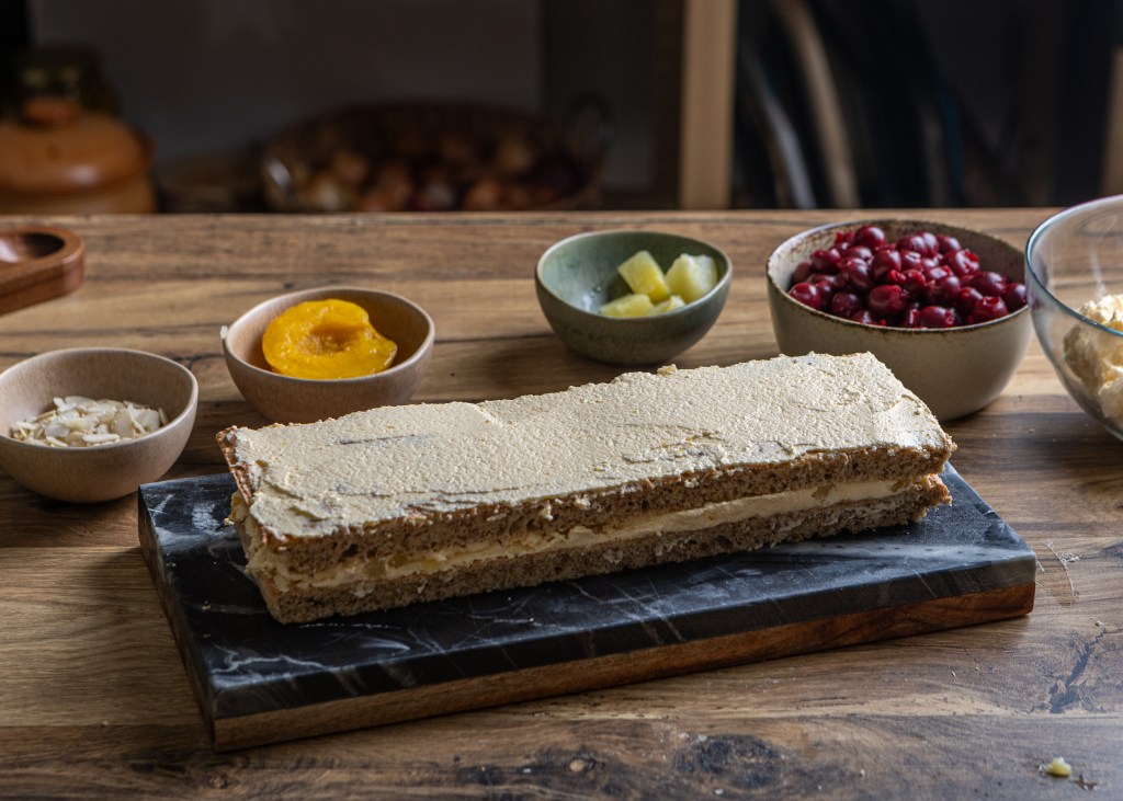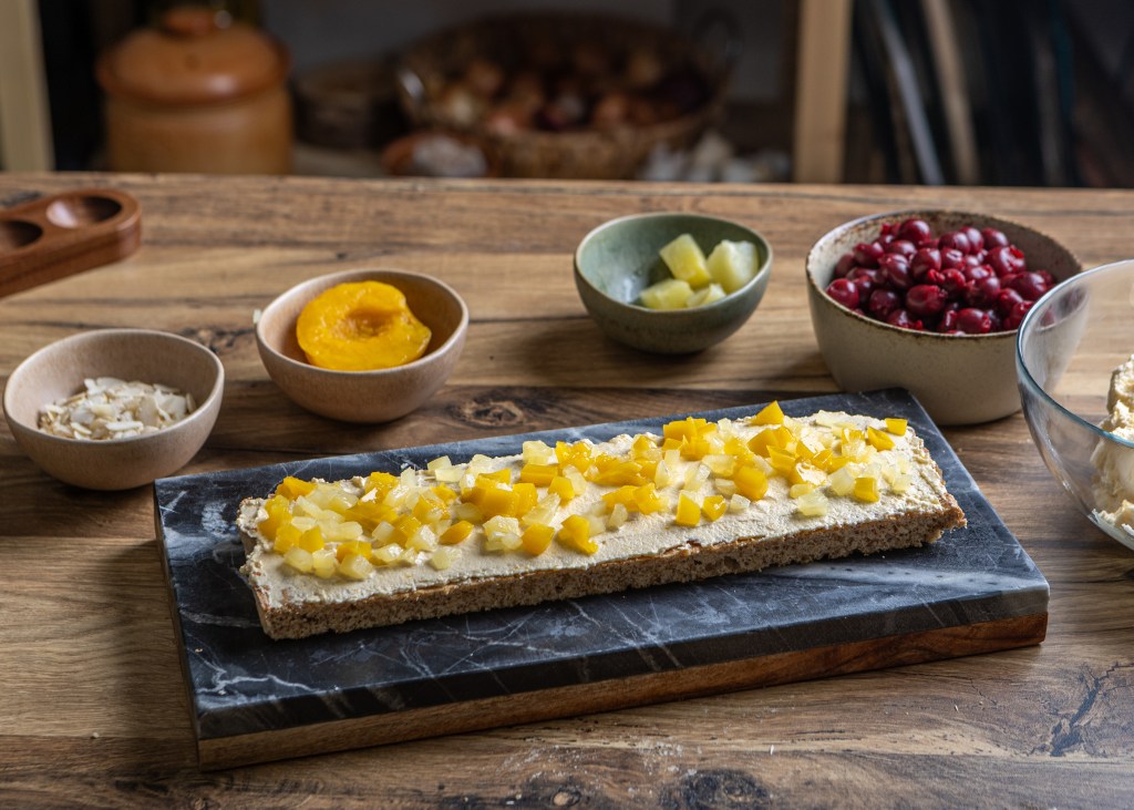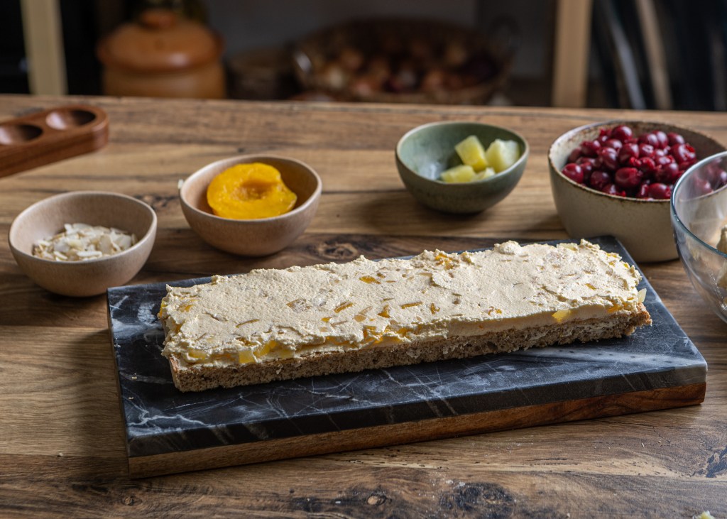 Postavite prvu koru na podlogu te na nju namažite tanki sloj kreme. Preko kreme rasporedite kockice ananasa i breskvi. Premažite još kreme preko voća te stavite sljedeću koru.
