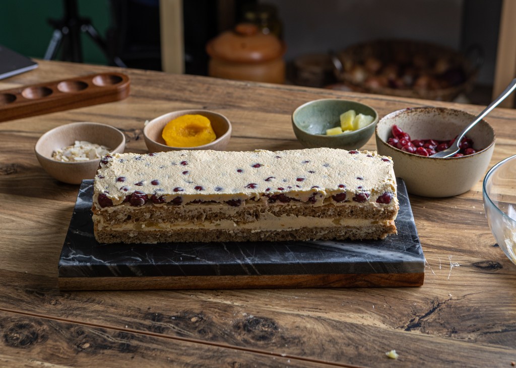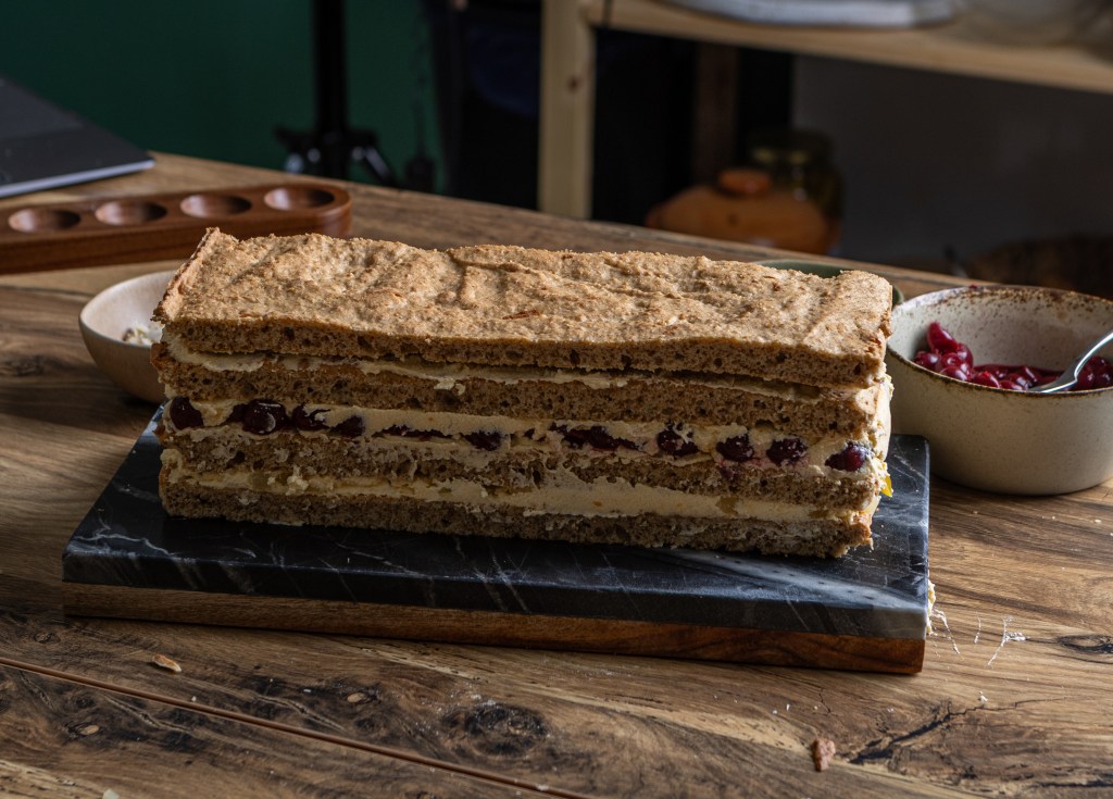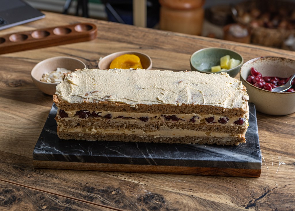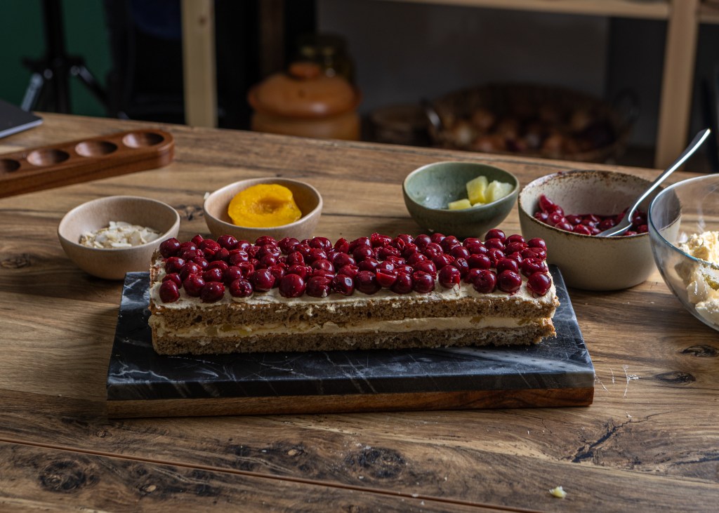 Na drugu koru opet namažite kremu ali ovaj put u malo debljem sloju te po njoj rasporedite višnje. Opet premažite kremom preko voća kako bi se sjedinilo. Postavite treću koru.