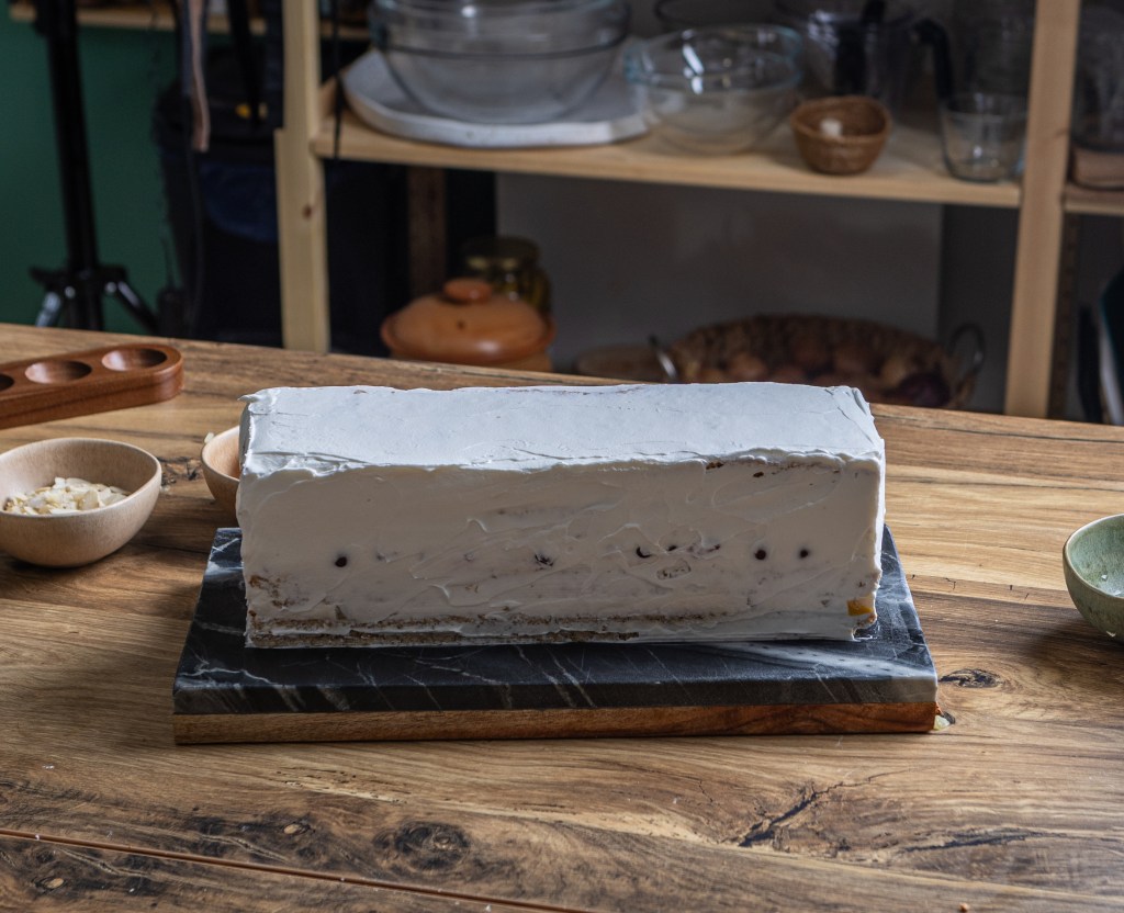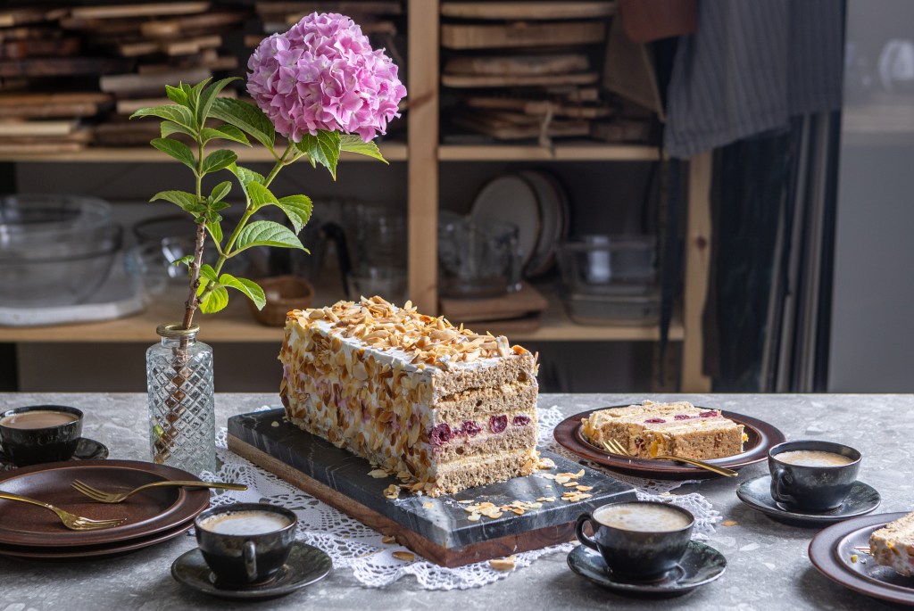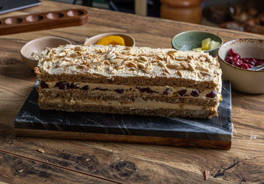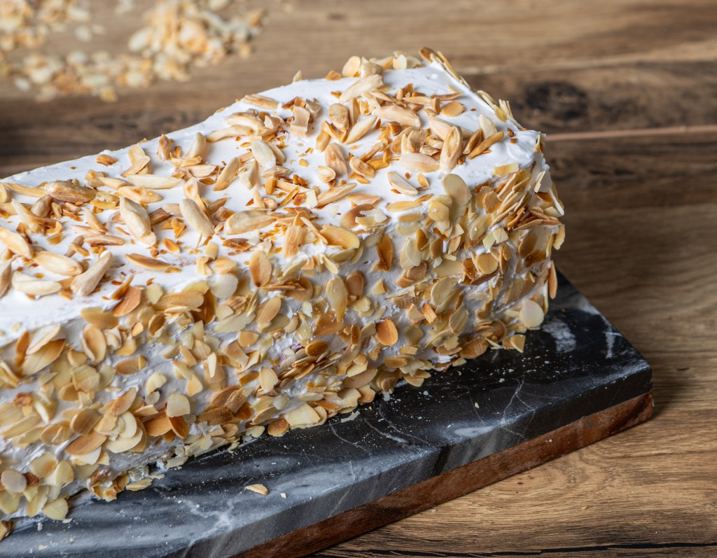 Lagano pritisnite s gornje strane kako bi sve sjelo na svoje mjesto. Tortu izvana premažite istučenim slatkim vrhnjem. S gore strane pospite ostatak sjeckanih badema a sa svih bočnih strana ju ukrasite prženim listićima badema. Neka se torta dobro ohladi u hladnjaku prije posluživanja, najbolje preko noći.