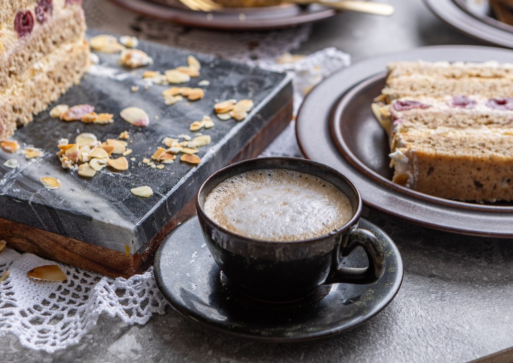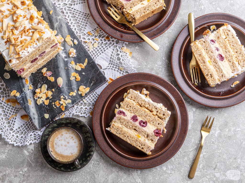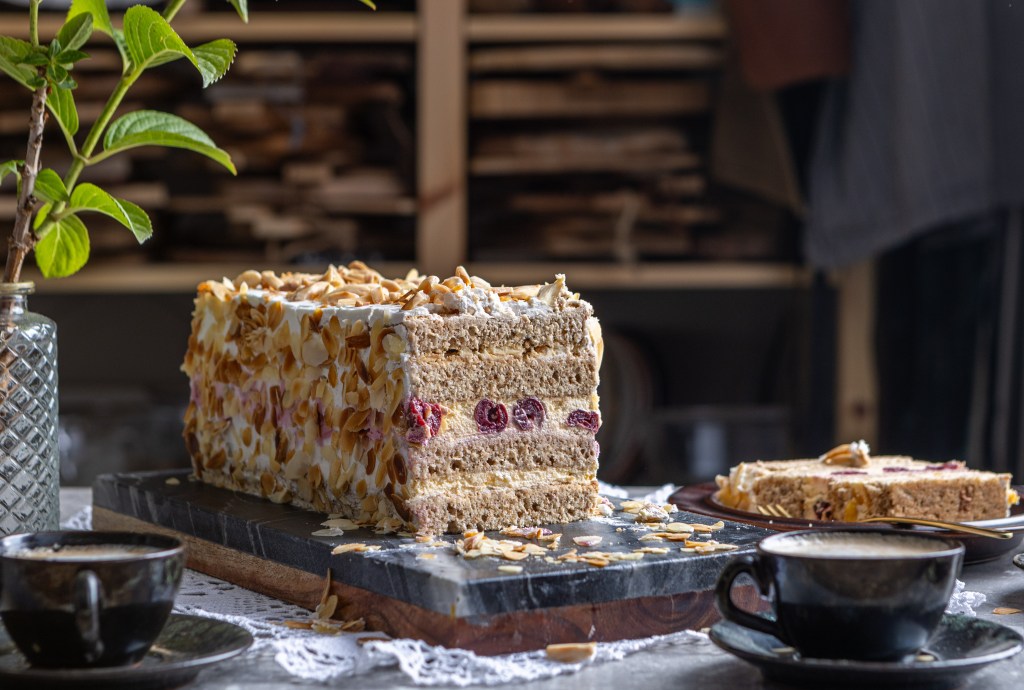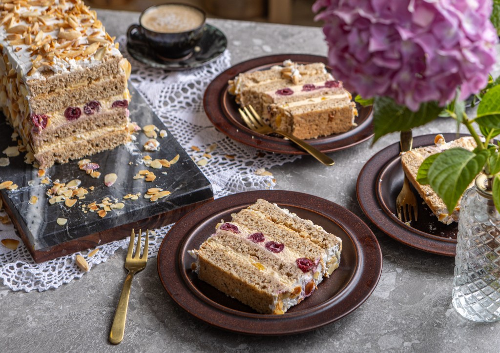 Na treću koru opet tanko namažite kremu i preko nje rasporedite polovicu sjeckanih prženih badema. Premažite s ostatkom kreme i stavite četvrtu koru.