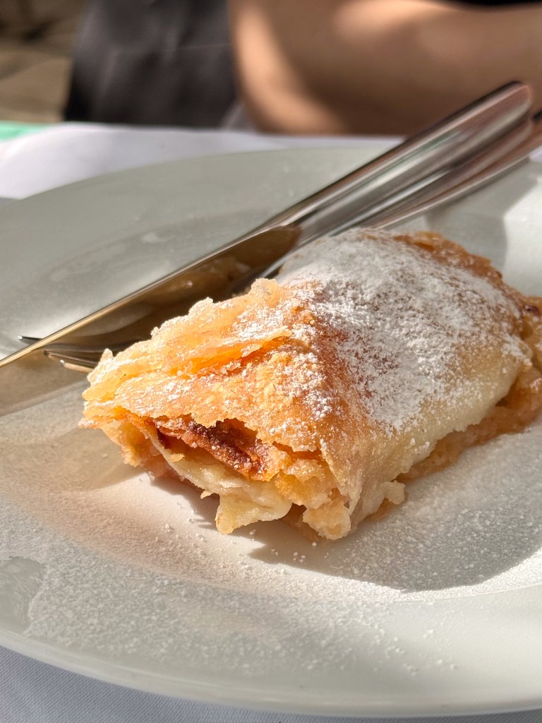 Ako voliš domaće deserte – štrukli sa sirom i šećerom dolaze zapečeni, taman slatki, i onako… utješni. Pita od jabuka ima onu hrskavu koricu koja ti pukne pod vilicom, a fil je pun komadića voća.